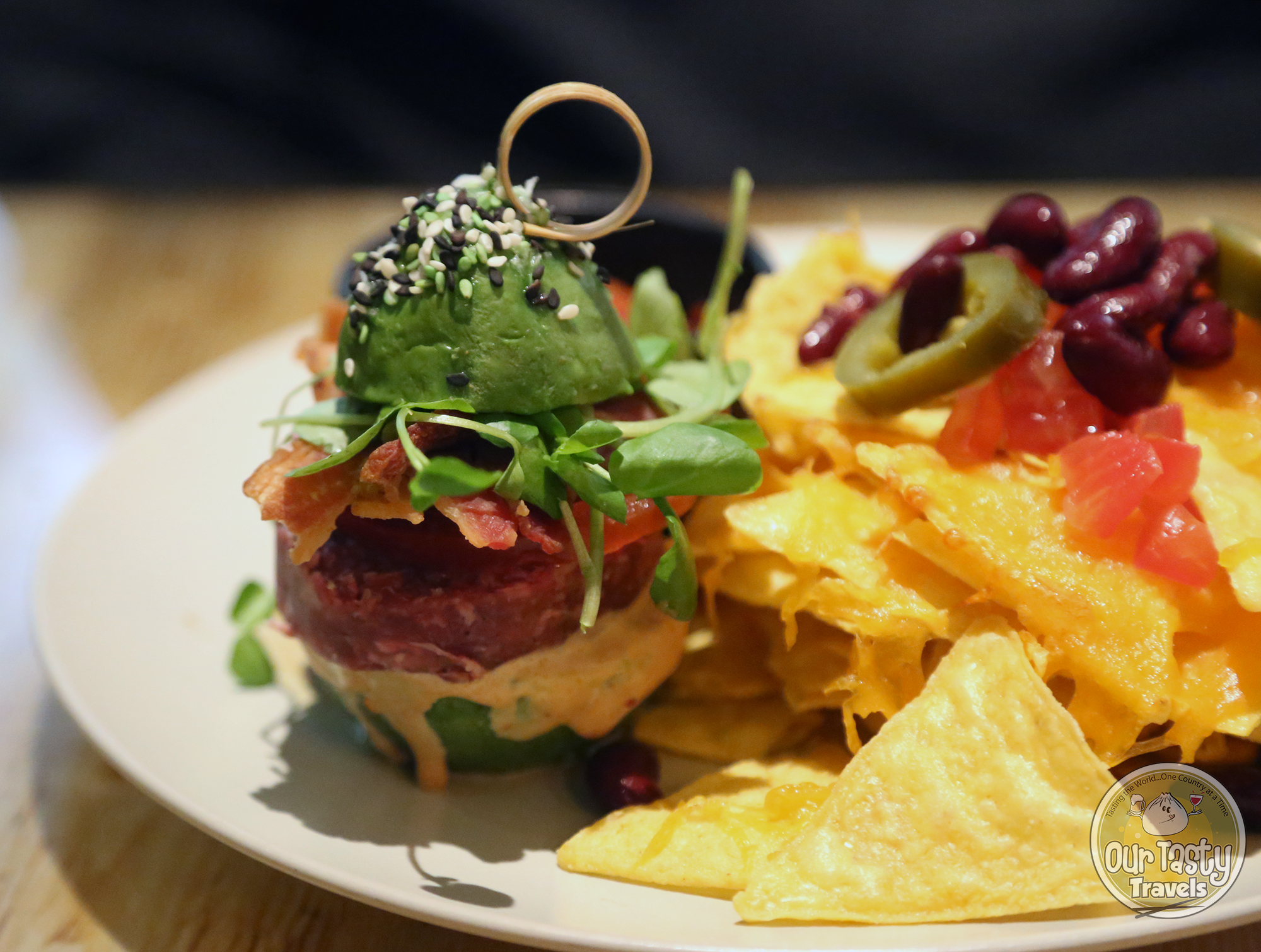 We started off with this interesting dish — a small “burger” made with Dutch smoked ‘ossenworst,’ or raw beef sausage from Holland. Instead of a traditional bun, the avocado takes its place. The Bun Burger also has bacon, tomato, red onions, and sauce. On the side is a small portion of nachos and salsa. This is a great option for an appetizer for two as you get to try some of the nachos as well (which seem to be one of the most ordered items by checking out tables around us).