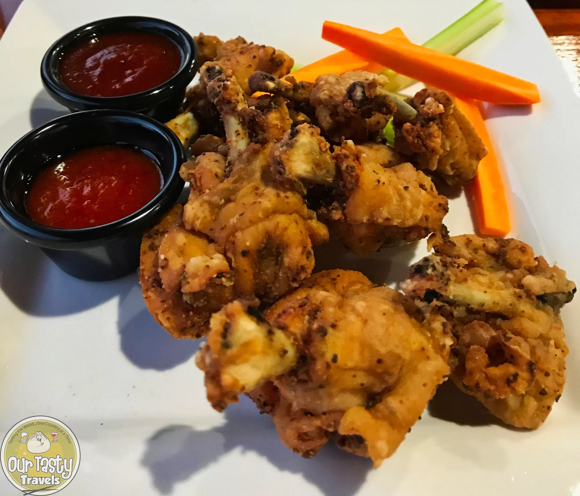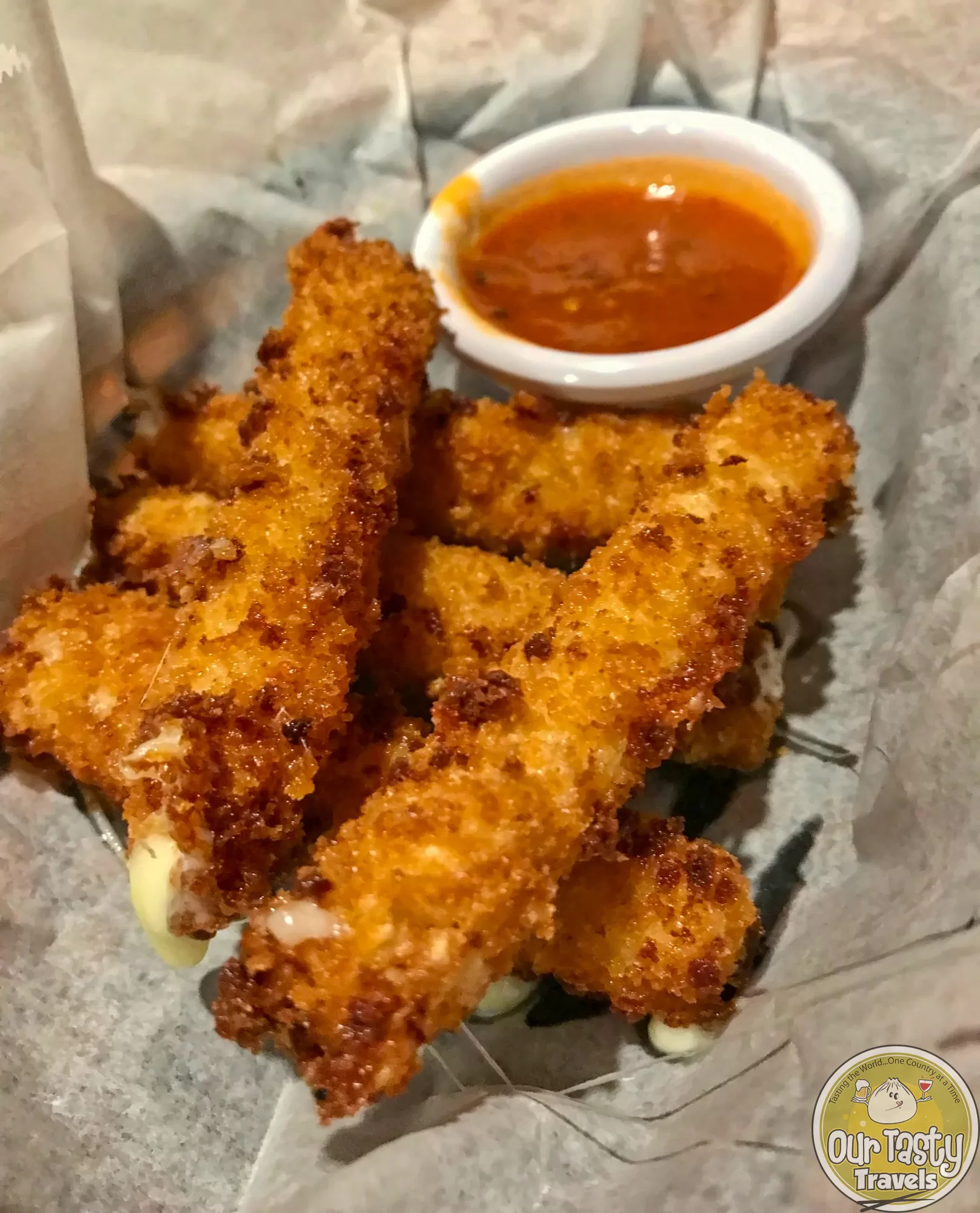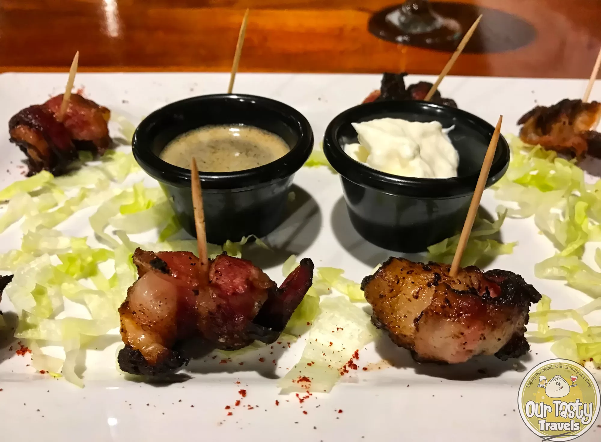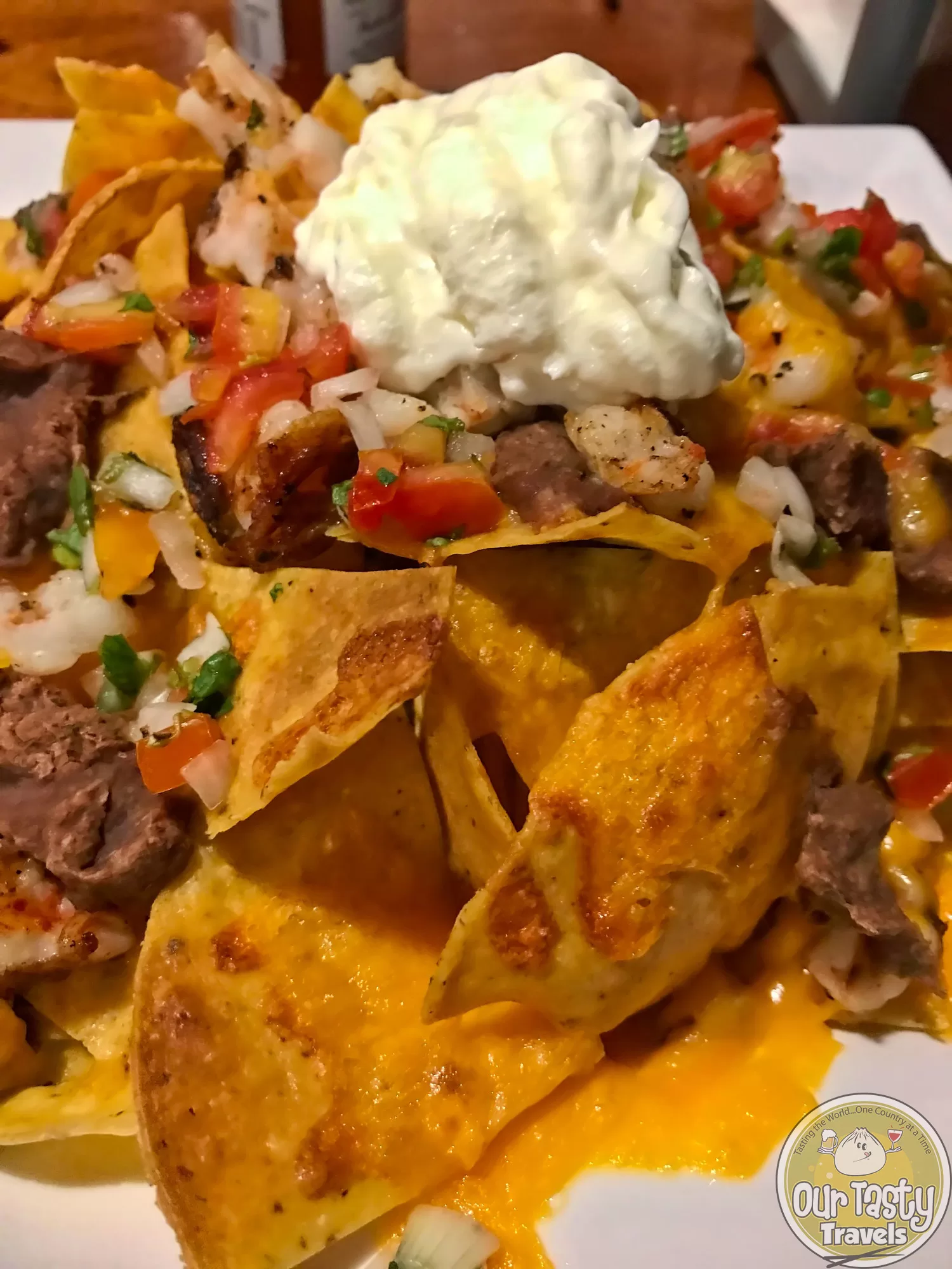 When the rest of our group arrived, they ordered bacon wrapped shrimp and cheese sticks. We ordered loaded nachos to finish off the evening’s tasting. The nachos were a decent portion size, with shrimp, beans, onions, tomatoes, and sour cream.