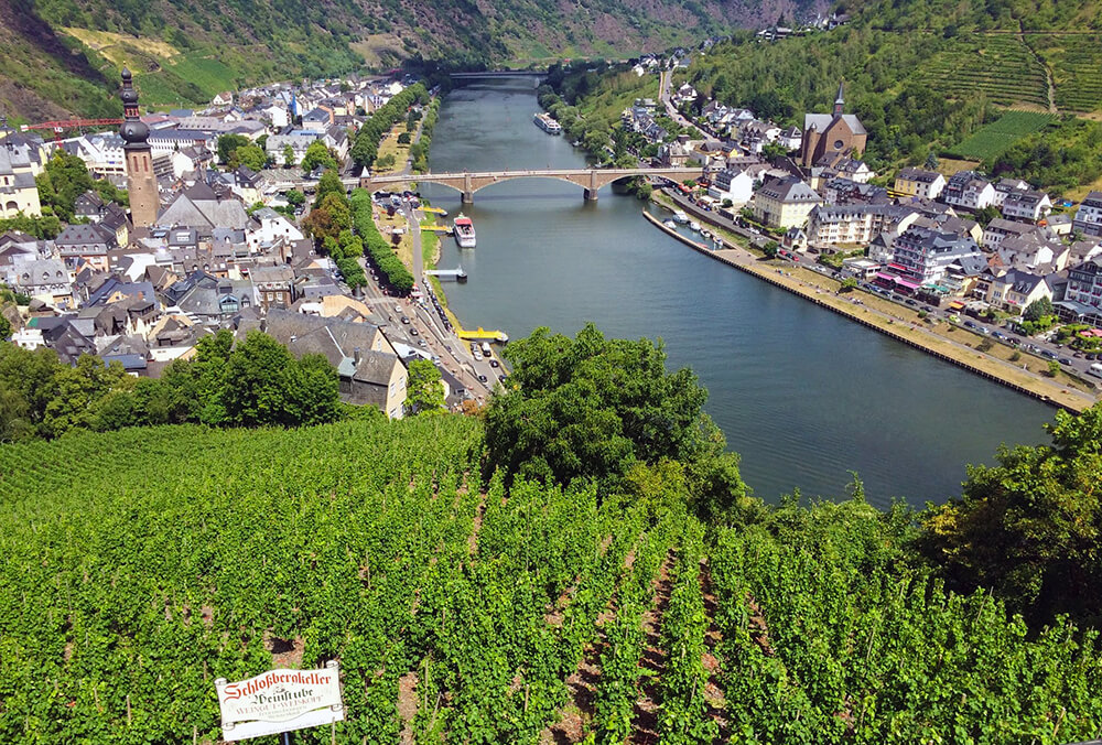 The scenic city of Koblenz is actually the convergence of the Moselle and Rhine Rivers. Dating back over 2000 years, the historic city is the ideal base if you want to visit both wine regions. Look for history, culture, good food, and of course, excellent wines at every turn. The Ehrenbreitstein Fortress sits high above the Rhine, providing stunning views down to Koblenz and the rivers.